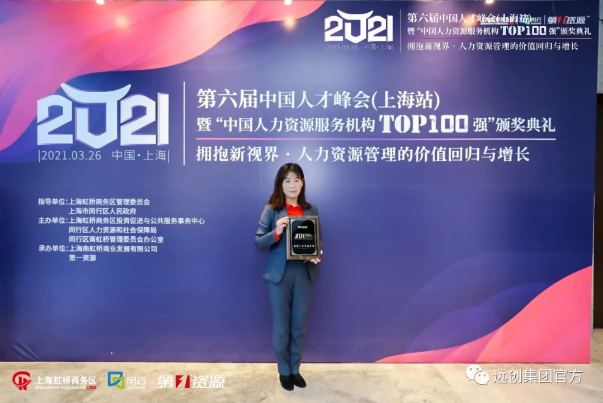 2021年3月26日,“拥抱新视界·人力资源管理的价值回归与增长”2021第六届中国人才峰会(上海站)暨‘中国人力资源服务机构TOP100强’颁奖典礼”在上海隆重召开。很荣幸,远创人力资源集团成功入选“2021中国人力资源服务机构Top100 强”榜单。