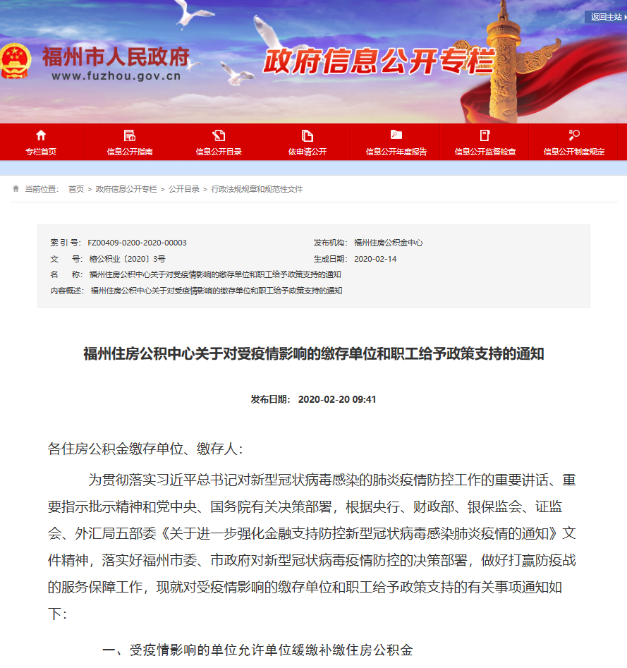 为贯彻落实习近平总书记对新型冠状病毒感染的肺炎疫情防控工作的重要讲话、重要指示批示精神和党中央、国务院有关决策部署,根据央行、财政部、银保监会、证监会、外汇局五部委《关于进一步强化金融支持防控新型冠状病毒感染肺炎疫情的通知》文件精神,落实好福州市委、市政府对新型冠状病毒疫情防控的决策部署,做好打赢防疫战的服务保障工作,现就对受疫情影响的缴存单位和职工给予政策支持的有关事项通知如下: