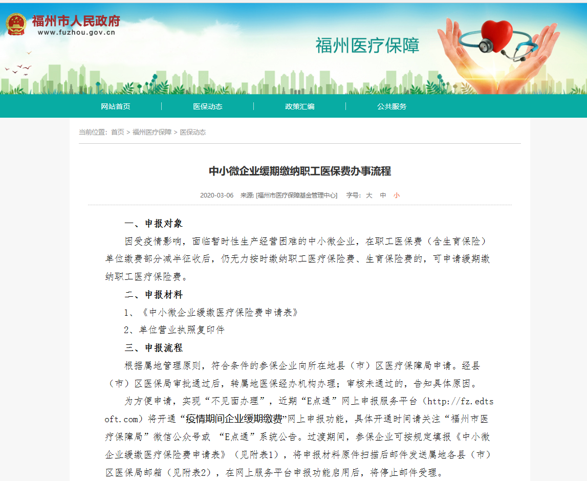 为方便申请,实现“不见面办理”,近期“E点通”网上申报服务平台(http://fz.edtsoft.com)将开通“疫情期间企业缓期缴费”网上申报功能,具体开通时间请关注“福州市医疗保障局”微信公众号或 “E点通”系统公告。过渡期间,参保企业可按规定填报《中小微企业缓缴医疗保险费申请表》(见附表1),将申报材料原件扫描后邮件发送属地各县(市)区医保局邮箱(见附表2),在网上服务平台申报功能启用后,将停止邮件受理。