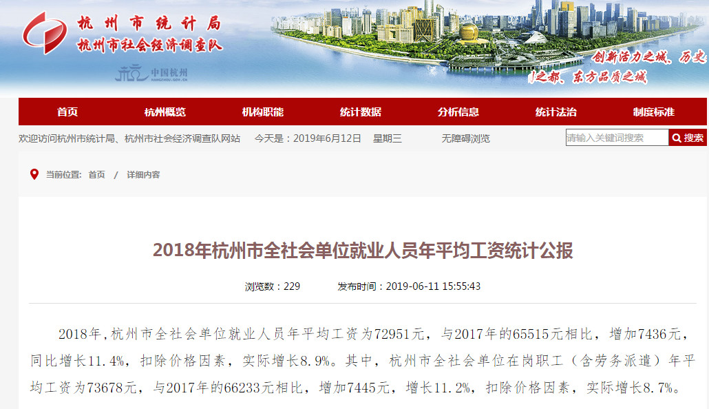 2018年杭州市平均工资出炉!