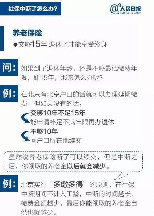 在养老保险问题上,必须要缴够15年才能领取养老金,如果社保中断,将会导致以后领取的养老金额度变小。