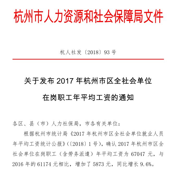 2017年杭州市区全社会在岗职工(含劳务派遣)年平均工资为67047元,与2016年的61174元相比,增加了5873元,同比增长9.6%。
