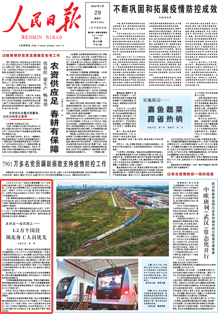 3月29日《人民日报》头版上,刊登了《点对点一站式招工——1.2万个岗位湖北务工人员优先》,聚焦佛山企业助力湖北务工朋友来佛山就业,为打赢疫情防控阻击战,实现全面复工复产努力。