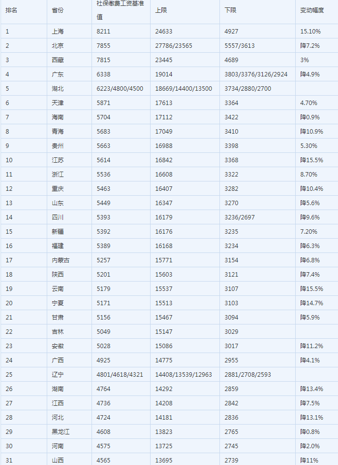 今天,31个省市地区已全都公开宣布2019年社保缴费基数。上海市、北京市、西藏自治区居前三位,社保缴费基数分别为8211元、7855元、7815元。接下来云南远创人力资源就带大家一起来看看吧: