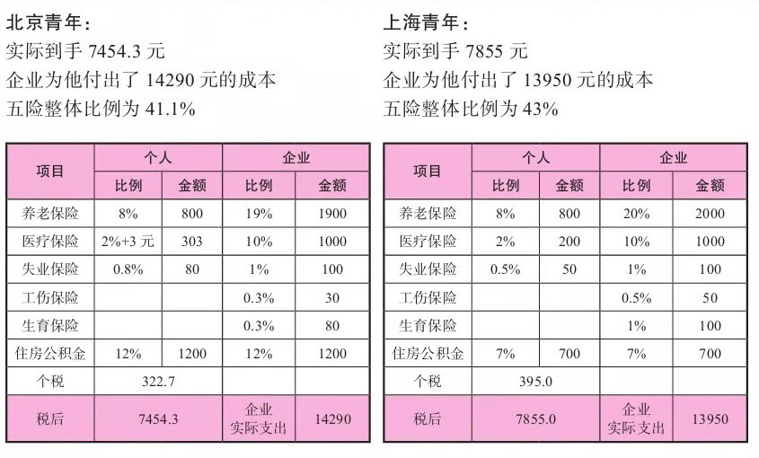 看到这里,相信大家对社保的五险有了初步了解。我准备了一张图,按照税前1万元的工资,分别算了算北京青年与上海青年每个月分别需要缴纳的五险一金的比例与实际到手的金额。大家可以对照看看(见图-3),就会对自己的工资单中的条目更加一目了然了。