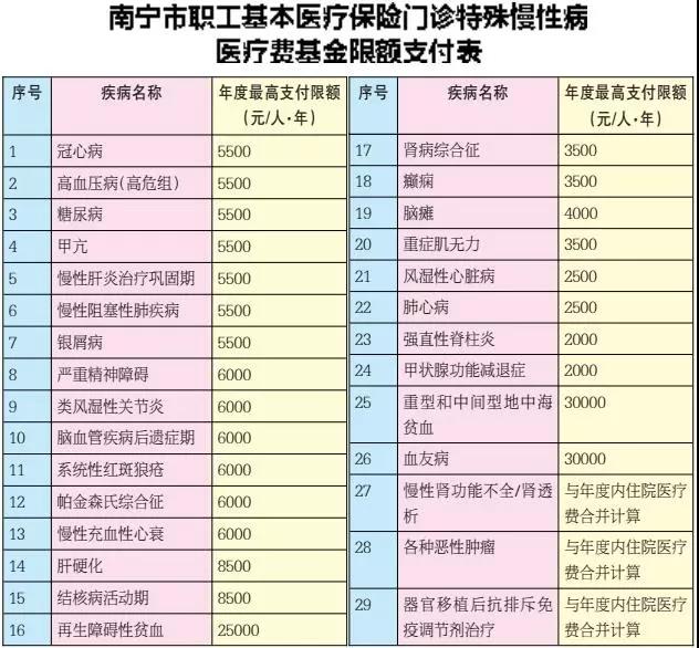二是将南宁市参保职工血友病、重型和中间型地中海贫血等2个门诊特殊慢性病病种年度统筹基金最高支付限额从每人每年25000元调整为每人每年30000元。