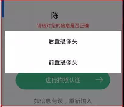 点击“进行拍照认证”按钮,这时会弹出选项摄像头的提示。可以根据使用场景选择前后摄像头,帮助他人认证可以选择后置摄像头,如果自己认证可以选择前置摄像头。