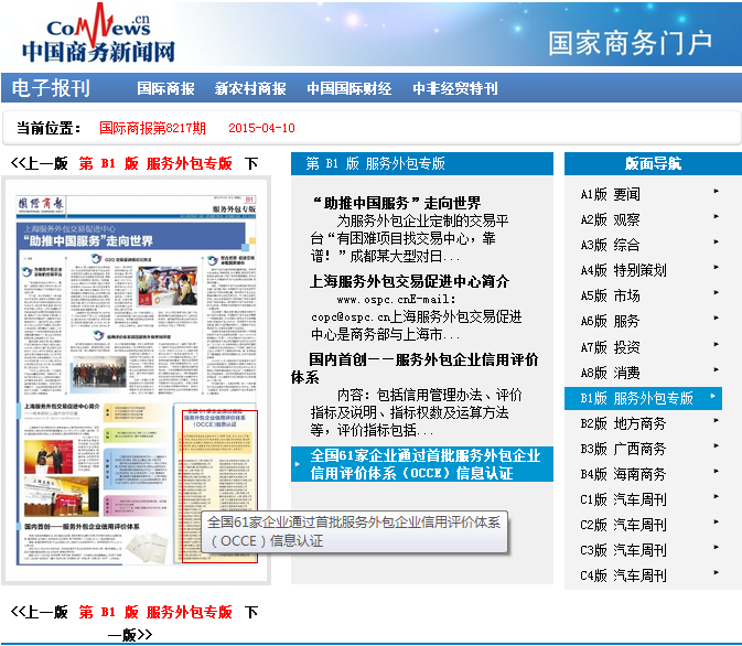 通过首批通过OCCE信息认证的企业已在4月10日的《国际商报》(中、英文版)上刊登(http://epaper.comnews.cn/read-1951-41120.html),并在4月12日由中国服务贸易协会主办的第五届中国服务外包产业与人才培养峰会上向全国发布。