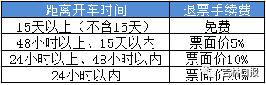 开车前15天(不含)以上退票的不收取退票费