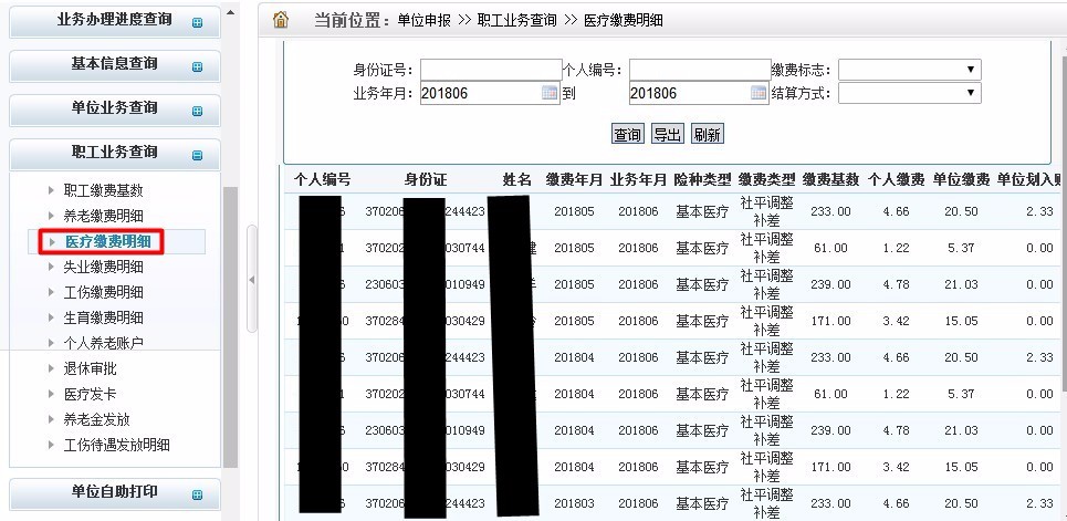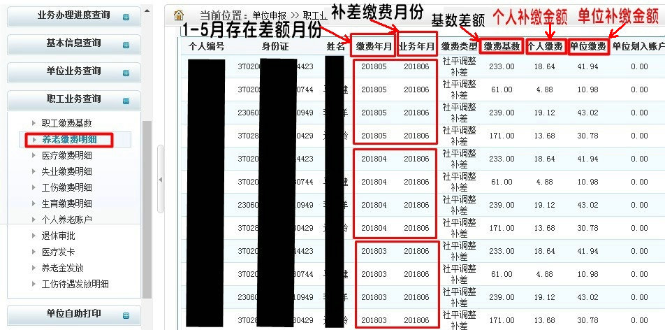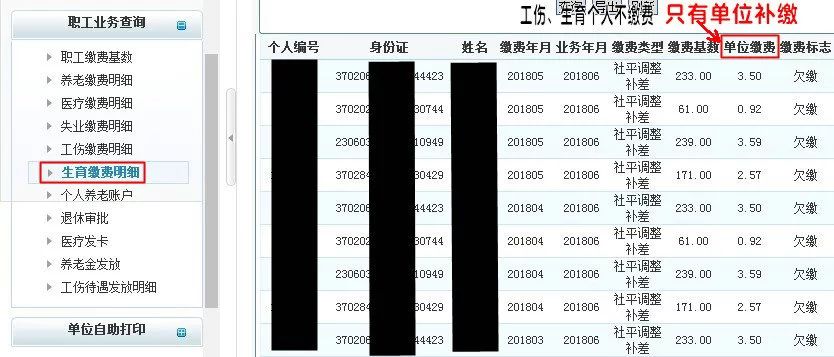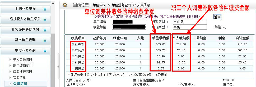 社平调差补缴金额,单位补缴金额、个人补缴金额,查询一下就知道,五项险种明细全都有。