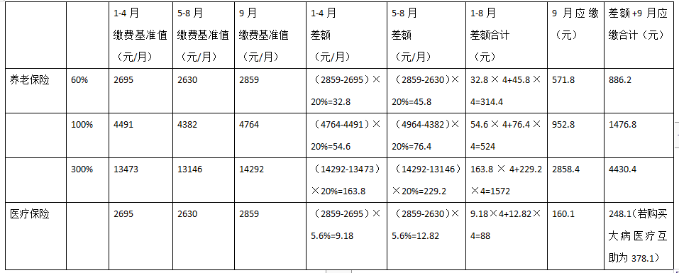 9月开始按新缴费标准缴费,并对今年前8个月差额进行补缴。补收标准如下:
