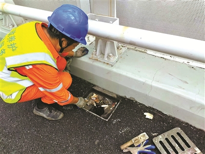 外滩大桥泄水孔清理。(市政部门 供图)