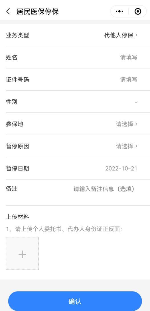 业务类型选择“代他人停保”,按页面要求填写申办医保停保业务所需信息并上传个人委托书(未成年人提供户口簿)、代办人身份证正反面,完成后点击“确认”。变更结果信息可在前端页面展示或通过“居民医保停保”查询业务办理结果。