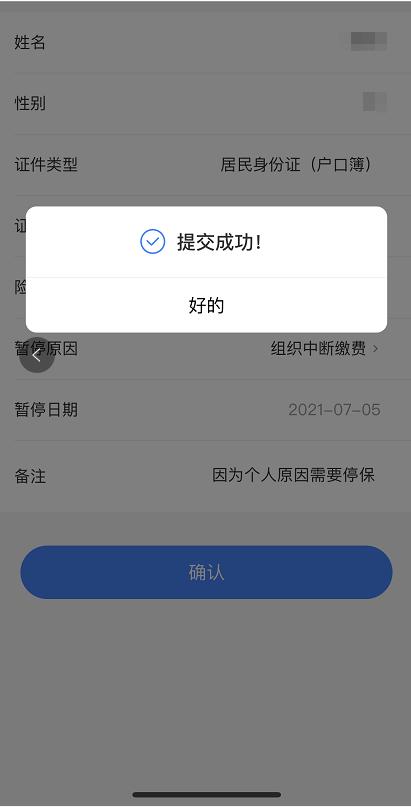 业务类型选择“自己停保”,按页面要求填写申办医保停保业务所需信息,完成后点击“确认”,系统显示“提交成功”。