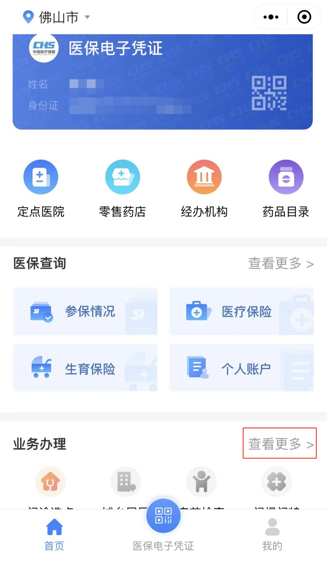“业务办理”中点击“查看更多”,后点击“居民医保停保”进入操作页面。