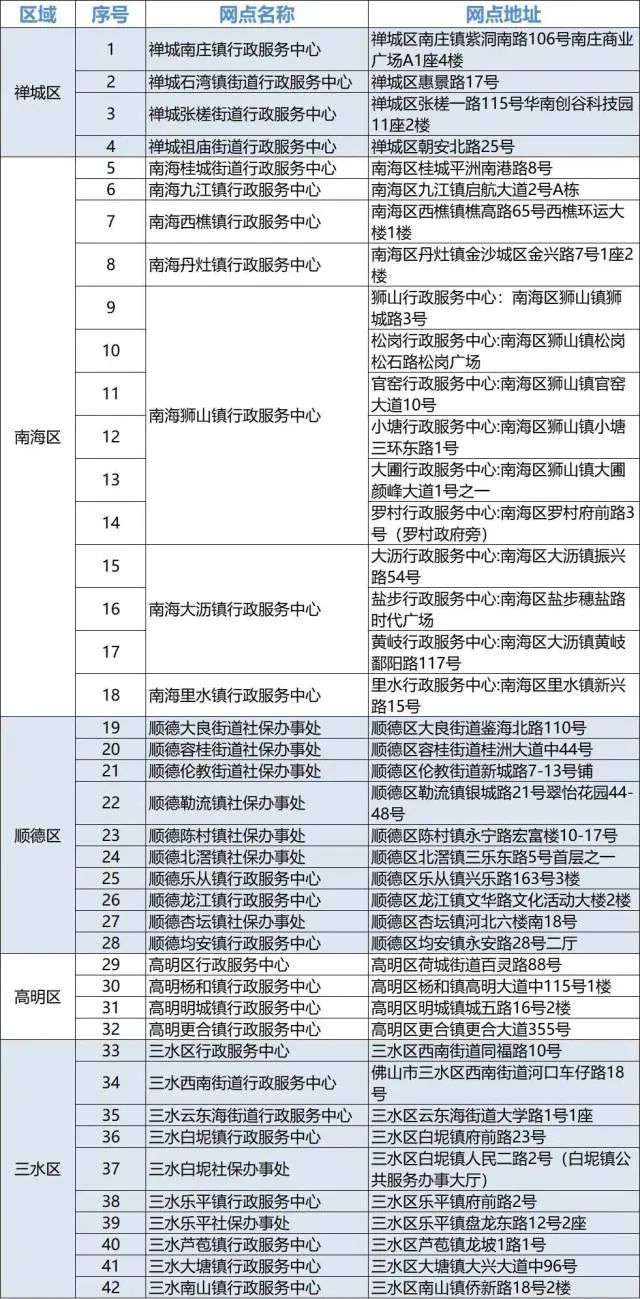 佛山市社保42个“全市通办”服务网点
