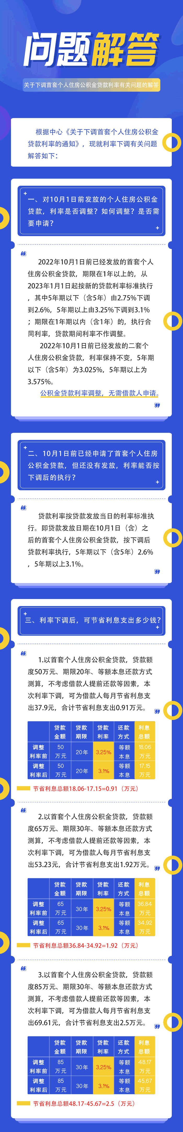 根据《中国人民银行关于下调首套个人住房公积金贷款利率的通知》,2022年10月1日起,下调首套个人住房公积金贷款利率0.15个百分点,1-5年期由2.75%下调至2.6%,5年以上由3.25%下调至3.1%。