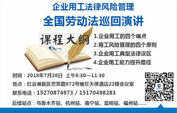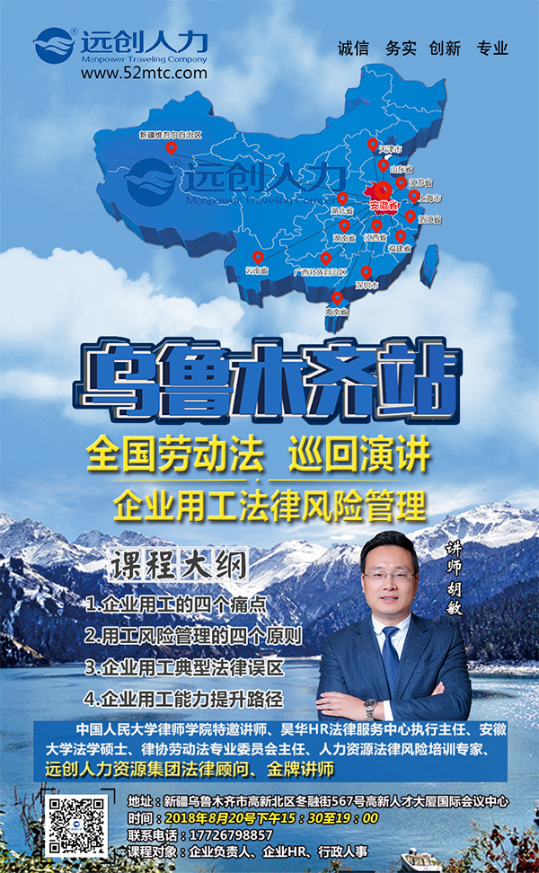 2018年7月28日上午远创人力“劳动法管理课程全国巡讲-南昌站”活动位于江西省南昌市世贸路维珍天使酒店22楼会议室举行!本次活动由远创人力集团和江西远创人力资源管理有限公司主办!由中国人民大学律师学院特邀讲师,安徽大学法学硕士胡敏胡律师主讲!