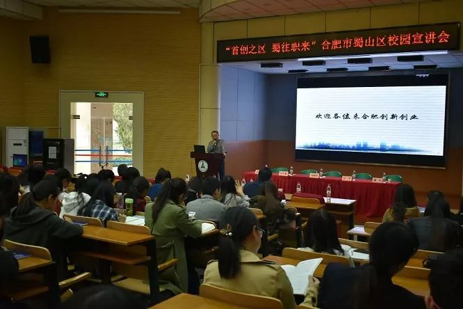 为进一步引导各类人才来肥创新创业,在两所高校报告厅内,分别安排了一场政策宣讲会。市人力资源和社会保障局人才开发处副处长叶学强从历史文化、产业特色以及“十二五”期间发展等方面介绍了合肥,并重点解读了合肥市最新出台的人才新政;区人力资源和社会保障局党委书记、局长谷和亮则联系自身求学、走上工作岗位的经历和高校学子忆往昔、谈初心,并从交通、经济、科教、生态、政策等多角度介绍合肥市蜀山区区情。最后,谷和亮向同学们发出了邀请:“合肥是广大青年人创业创新的宝地,是培养人才、涵养的地方,希望对合肥感兴趣的同学们到合肥来,到蜀山来就业创业”。