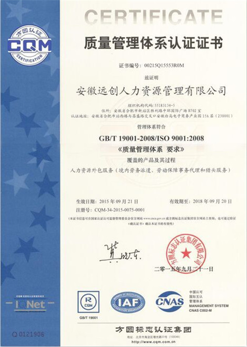 2015年9月,远创人力集团通过近一年的努力,积极配合方圆标志认证集团开展ISO9000质量管理体系认证审核工作,公司管理体系完全符合质量管理体系要求,并成为省内人力资源行业率先通过ISO9000质量管理体系认证的企业之一。