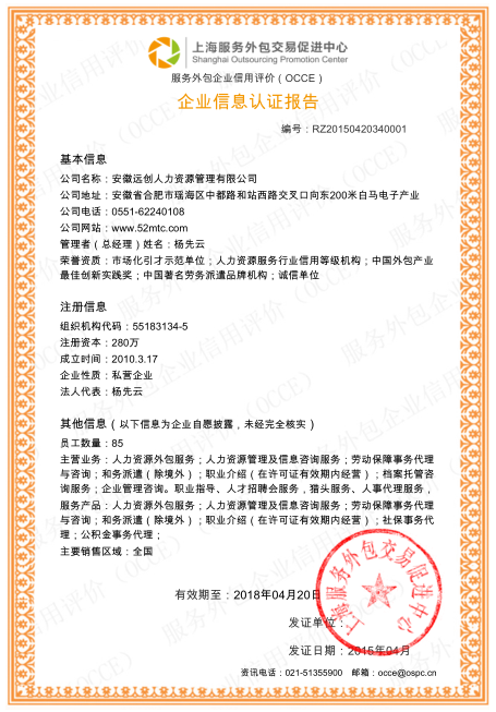 ◆2015年04月,远创人力连锁通过首批服务外包企业信用评价体系(OCCE)信息认证