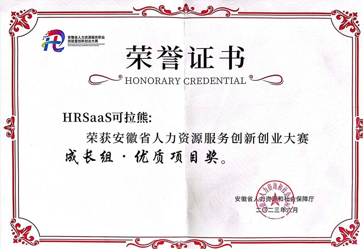 2023年12月,远创人力资源集团HRSaaS可拉熊荣获安徽省人力资源服务创新创业大赛成长组·优质项目奖