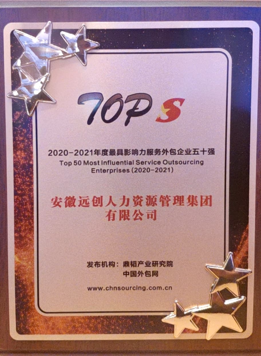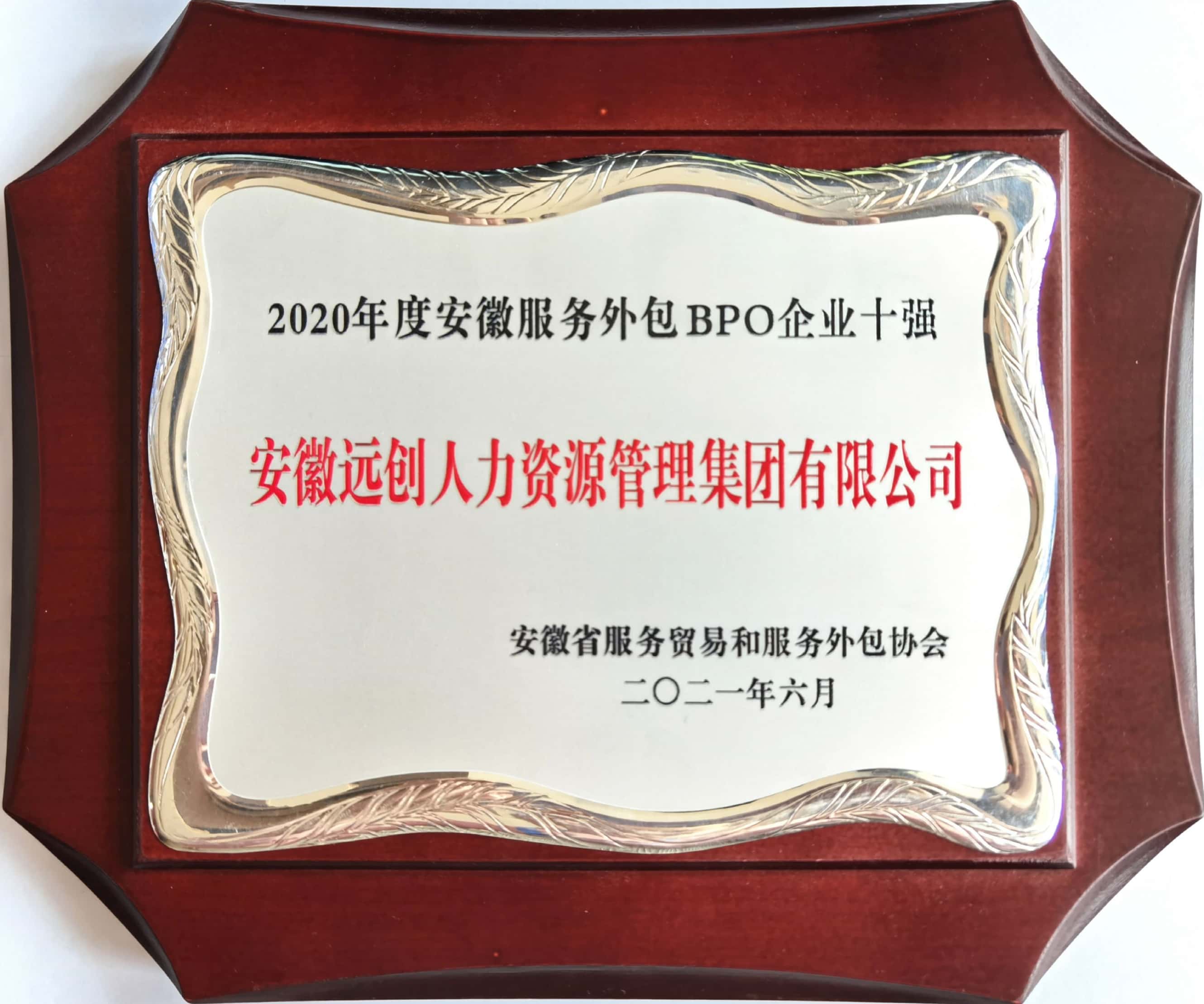 2021年6月,远创人力资源集团荣获“2020年度安徽服务外包BPO企业十强”奖项。