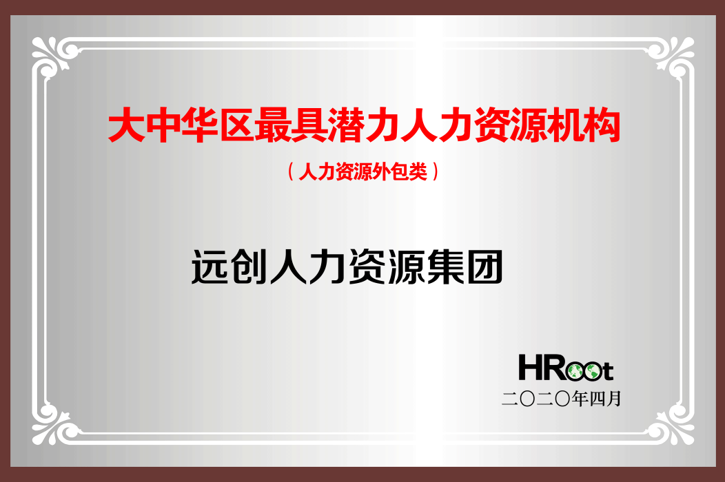 2020年4月,在“2019-2020大中华区最佳人力资源服务机构”评选中荣获奖项,对于远创人力资源集团来说,不仅是企业实力的展示,也是集团品牌价值和行业地位的提升,代表了行业权威机构及先锋企业对远创人力多年来不懈努力与创新给予的肯定,这是远创人力迈向又一新高度的重要里程碑。