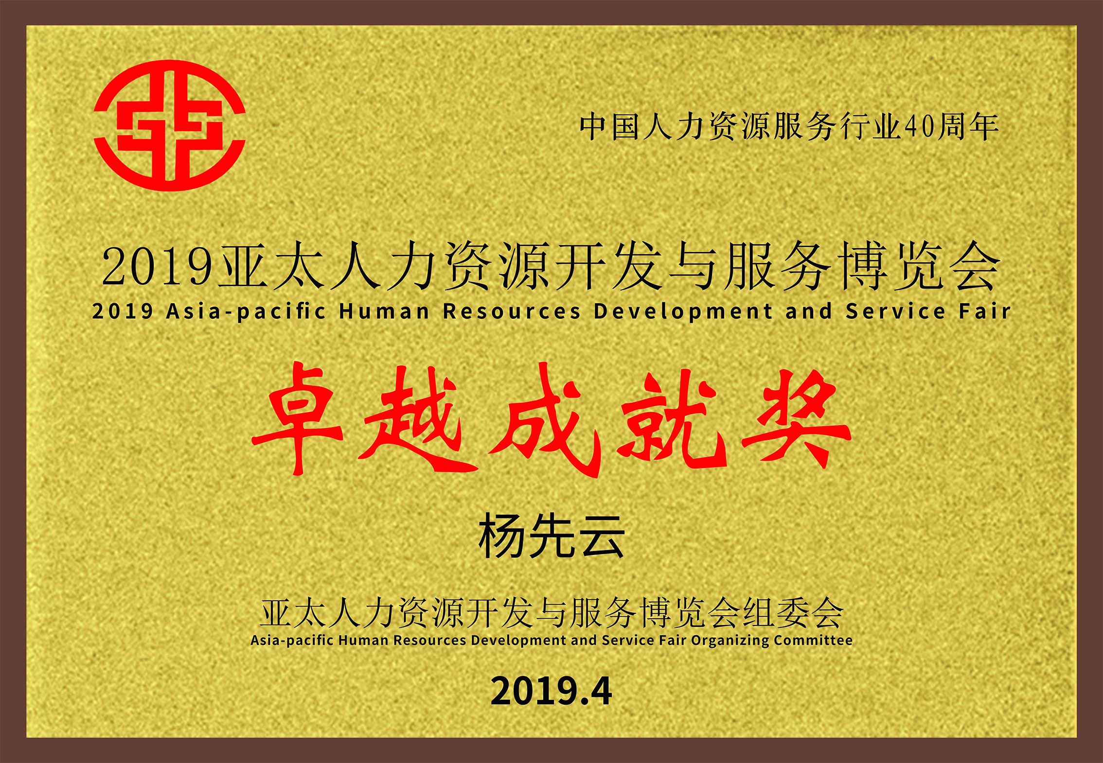 2019年4月,2019亚太人力资源开发与服务博览会暨第十五届中国人力资源服务业高峰论坛在深圳会展中心盛大举行,远创人力资源集团总裁杨先云先生荣膺“2019亚太人力资源开发与服务博览会卓越成就奖”。
