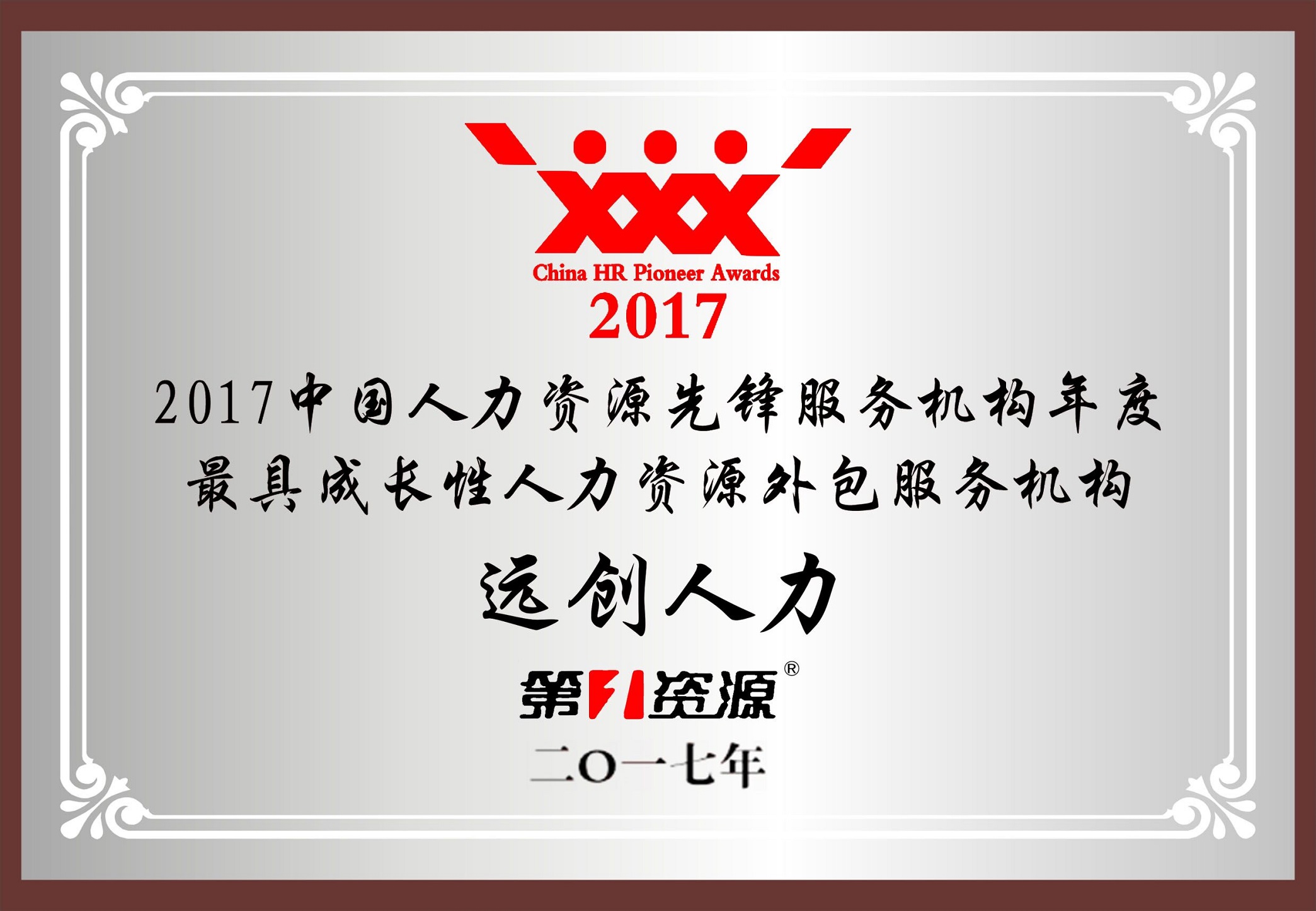 2017年12月19日,远创人力资源集团在《第一资源》主办的2017中国人力资源战略管理年会(第十届)暨2017中国人力资源先锋评选(第九届)中荣获“年度最具成长性人力资源外包服务机构”,标志着远创人力资源集团在全国服务外包领域具有一定的影响力和知名度。