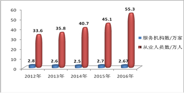 2016年,全国各类人力资源服务机构为28.2万家用人单位提供了劳务派遣服务,同比减少0.6%;派遣人员876万人,同比增加0.97%;登记要求派遣人员552万人,同比增加0.83%。各类人力资源服务机构为54万家用人单位提供人力资源外包服务,同比增长5.7%。
