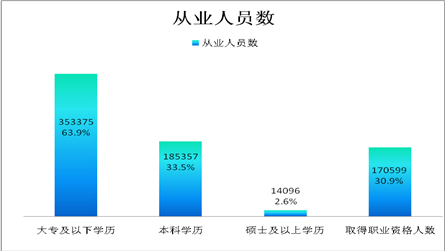 从从业人员学历层次分类来看,大专及以下学历353375人,占从业人员总量的63.9%;本科学历185357人,占33.5%;硕士及以上学历14096人,占2.6%;从业人员中取得从业资格证的有170599人,占从业人员总量的30.9%(见图3)。