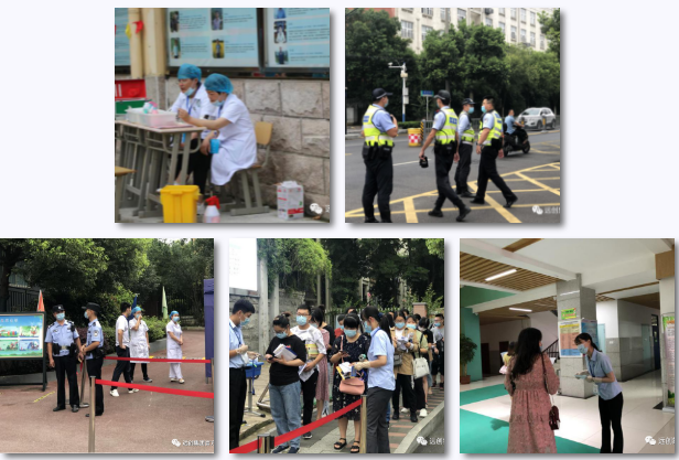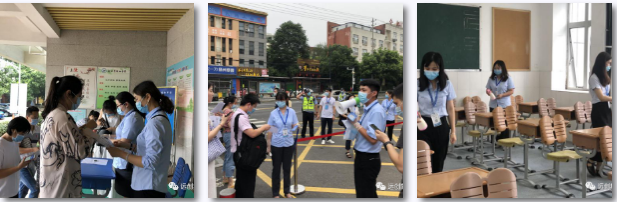 因考生人数多,疫情防控要求高,考点大门外设置临时留观点,配备专业医务人员和充足的防疫物资。对考场、考务室等工作场所进行了彻底清洁消杀。各考点准备了酒精、口罩等防疫物资,对特殊考生进行定向服务,考点设置了3至4个专用通道,以便快速查验考生的准考证、身份证、健康通行码和体温检测。考场内老师还进一步核实考生信息,收取健康承诺书,确保考试平安有序地进行。