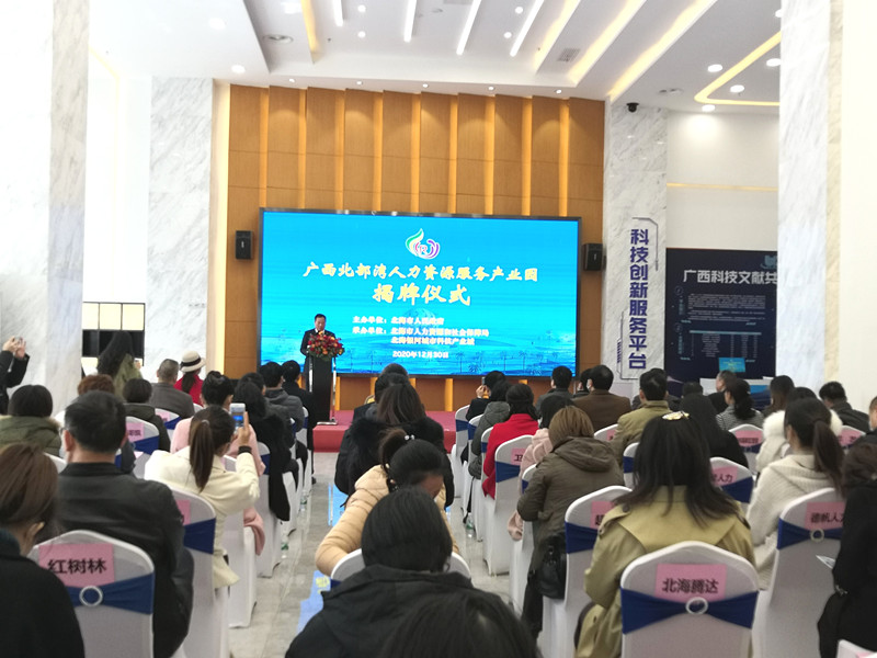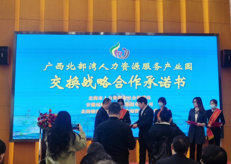仪式上,北海市人力资源和社会保障局、远创人力资源集团、北海银河城市科技产业运营有限公司三方交换了战略合作承诺书;人社厅党组成员、副厅长、一级巡视员蒋劼同志、北海市人民政府副市长欧余军同志、市委组织部副部长陈国伟同志、市发改委潘能辉同志、市财政局黄文同志、银河产业城雷立生先生共同为广西北部湾人力资源服务产业园进行揭牌。