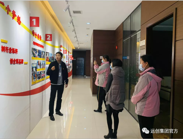 在解说员的引导下,朱俊玲园长一行实地参观了集团发展历程板块、“六人”(12333)党群文化体系、故事墙、群团活动室以及职工天地等,两位支部书记详细交流了关于党群文化体系建立的过程。