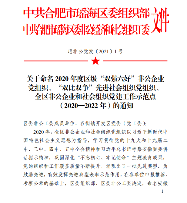 近日,中共安徽远创人力资源管理集团有限公司党支部荣获2020年度区级“双强六好”非公企业党组织称号。
