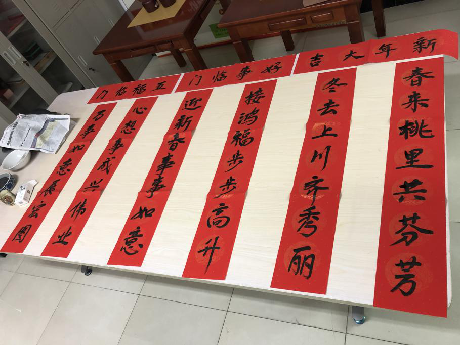 天气虽然寒冷,但活动室里洋溢出腊月天特有的喜庆。只见桌上铺开了喜气的大红纸,一位聋哑人挥毫泼墨,大笔挥毫出飘散着清新墨香的一副副寓意吉祥的春联,送上了新春的美好祝福。