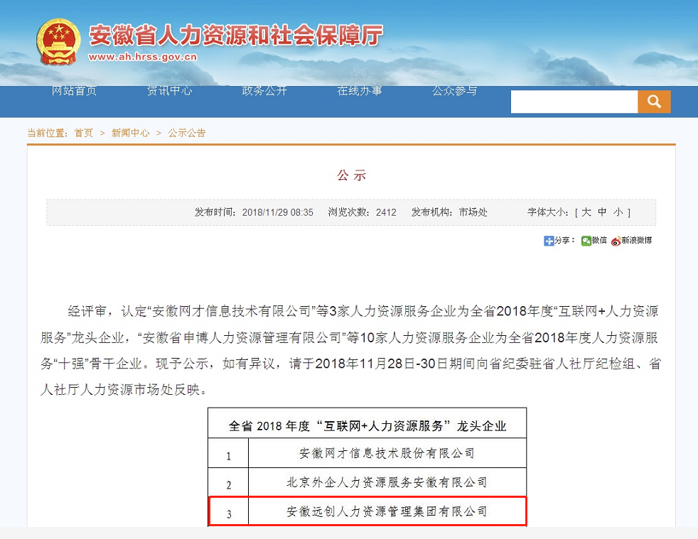 近日,安徽省人力资源和社会保障厅对外正式发布通报,确定3家人力资源服务企业为全省2018年度“互联网+人力资源服务”龙头企业,安徽远创人力资源管理集团有限公司名列其中。