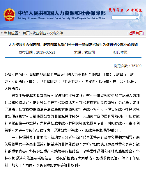 2月21日,人社部官方网站发布了《人社部、教育部等九部门关于进一步规范招聘行为促进妇女就业的通知》。